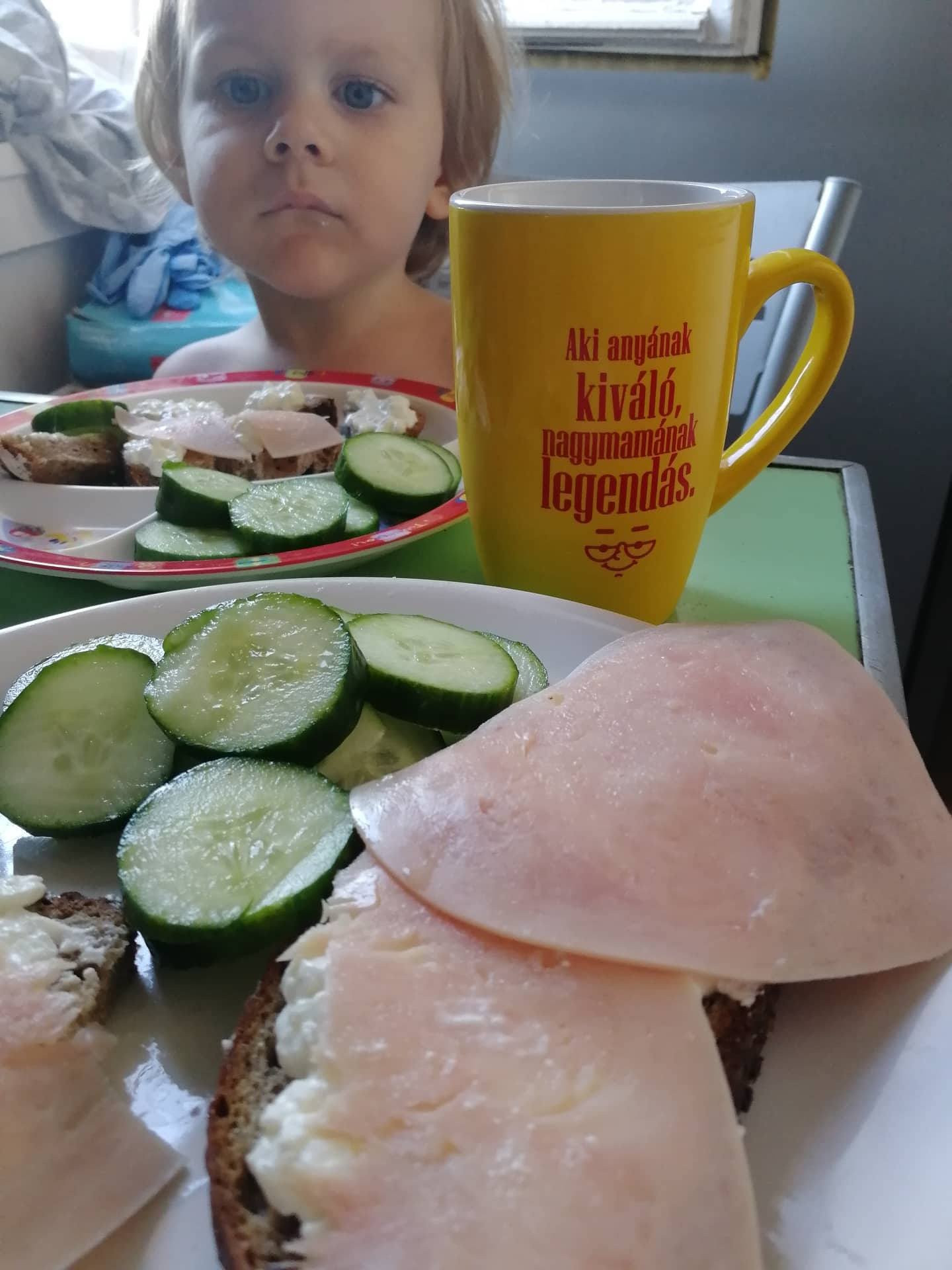-Reggeli: a nap legfontosabb étkezése, sosem hagyjuk ki! Reggelire általában teljes kiörlésű vagy rozsos kenyeret kap, margarinnal vagy cottage cheese-el megkenve. Néha napján abonettet vagy pufi rizst kér kenyér helyett. Imád mellé mozarellát, paradicsomot, uborkát és paprikát enni. 🙂 Felvágott többnyire pulykamell sonka, néha téli szalámi, párizsi. Ha nem szendvicset eszik akkor virslit szokott enni házi ketchuppal, zöldségekkel, néha abonettel vagy pufi rizzsel.